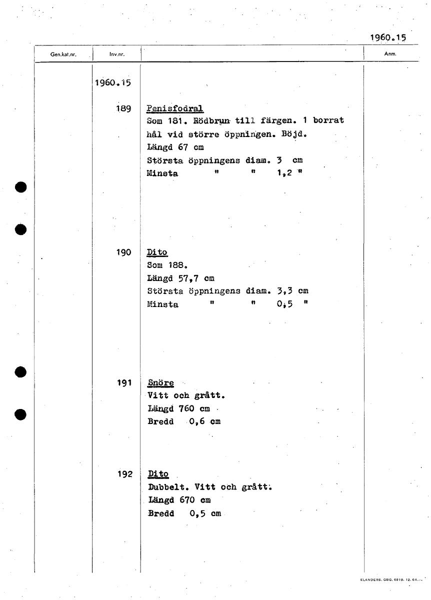 • 1960.15 1960.15 489 Penisfodral Som 181. Rödbrgn till färgen. 1 borrat häl vid större öppningen. Böjd. Längd 67 cm Största öppningens diam. 3 cm Minsta 1 " 190 Dito Som 188. Längd 57,7 cm Största öppn... Visa hela