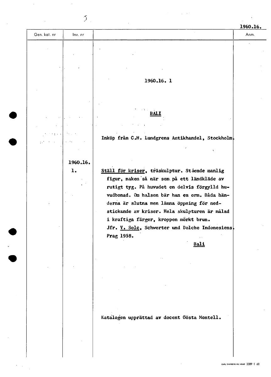 1960.16. 1960.16. 1 BALI Inköp från C.H. Lundgrens Antikhandel, Stockholm 1960.16. 1. Ställ för kriser, träskulptur. Stående manlig figur, naken'så när som på ett ländkläde av rutigt tyg. På huvudet en delvis förgylld hu- vudbonad. Om halsen bär han en orm. Båda hän- derna är slutna men lämna öppning för ned- stickande av kriser. Hela skulpturen är målad i kraftiga färger, kroppen mörkt brun. Jfr. V. Solc, Schwerter und Dolche Indonesiens Prag 1958. Bali Katalogen upprättad av docent Gösta Montell. [ocr]Stäng