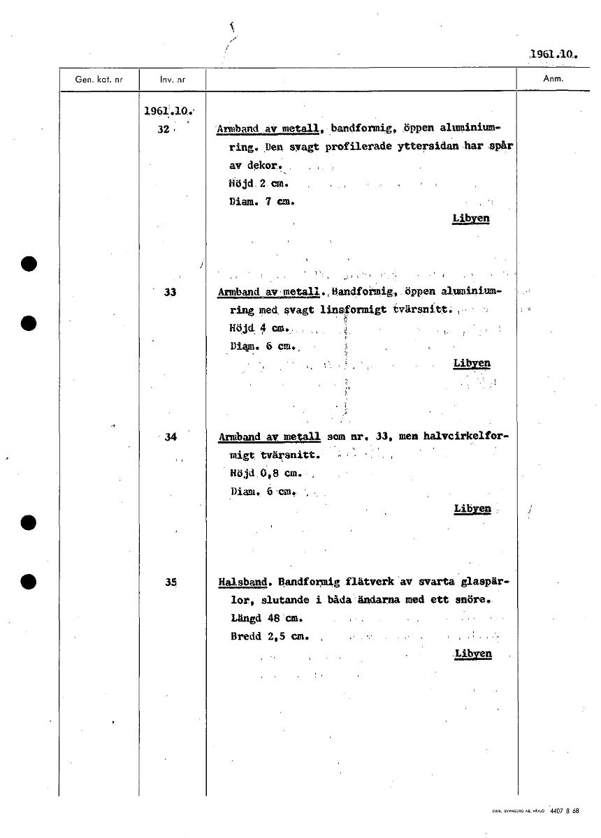 • 1961.10,. 1961:.10. 32 Armband .av metall ,bandformig, öppen aluminium- ring. lien svagt profilerade yttersidan .harspår av dekor. . Höjd,2.cm. Diam. 7 cm. Libyen 33 Armband avmetall.,BandforTig. _öpp... Visa hela