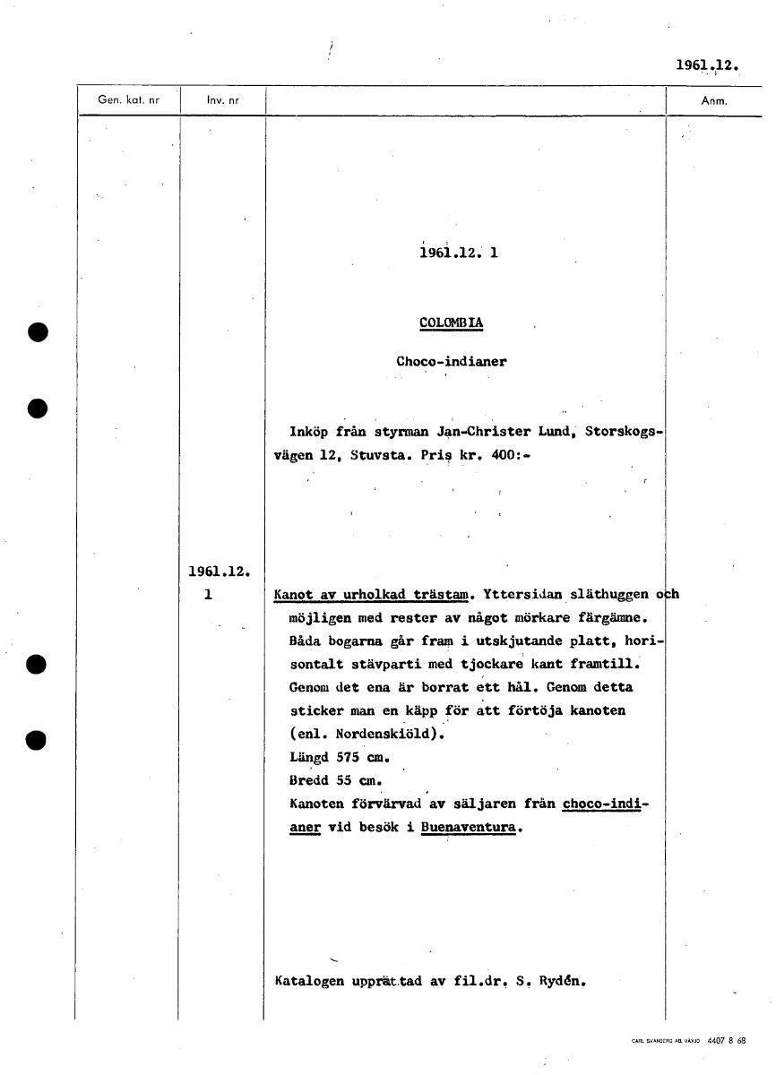 1961.12. 1961.12. 1 COLOMBIA • Choco-indianer Inköp från styrman Jan-Christer Lund, Storskogsvägen 12, Stuvsta. Pris kr. 400:- 1961.12. 1 Kanot av urholkad trästam. Yttersidan släthuggen och möjligen med rester av något mörkare färgämne. Båda bogarna går fram i utskjutande platt, horisontalt stävparti med tjockare kant framtill. Genom det ena är borrat ett hål. Genom detta sticker man en käpp för att förtöja kanoten (enl. Nordenskiöld). Längd 575 cm. Bredd 55 cm. Kanoten förvärvad av säljaren frän choco-indianer vid besök i Buenaventura. Katalogen upprättad av fil.dr. S. Ryddn. [ocr]Stäng