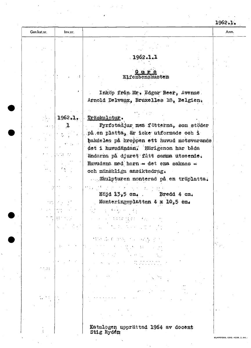 1962.1. Eldenbe4:014t*eteti. Inköp från, Mr: grigar' Beett,. Avenue Arnold PelvaUx, Brtixe1let; 18, Belgien. !Xr äskul_p t . Fyrfotadjur, men, .f öttetna,. Som stöder plattak är icke' Utformade och i bakdelen på kroppen ett huvud totsVarande det i huvudäpda.314) Ijärigånora har båda 'ändarna på djuret-fått samma Utseende. Huvudena .med: horn det ena saknas — och mänSkliga ansiktsdrag. .,,Skulpturen. monterad på en träplatta. Höjd 13'95 ema 'Bredd 4 cm, Monteringsplattan 4 x 1005 mad Katalogen upprättad 1964 av docent Stig Ryddtk [ocr]