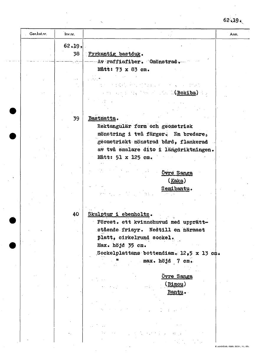 • 6219.0N 62.190 38 Fyrkantig bastduk.• Av-raffiafiber. 'Omönstrad-ö- tt: 73 x 83 om. (Bokiba) 39 Baattatta. Rektangulär 'form och geoMetrisk mönstring i två färger,: En bredare geometriskt mönstrad bår... Visa hela
