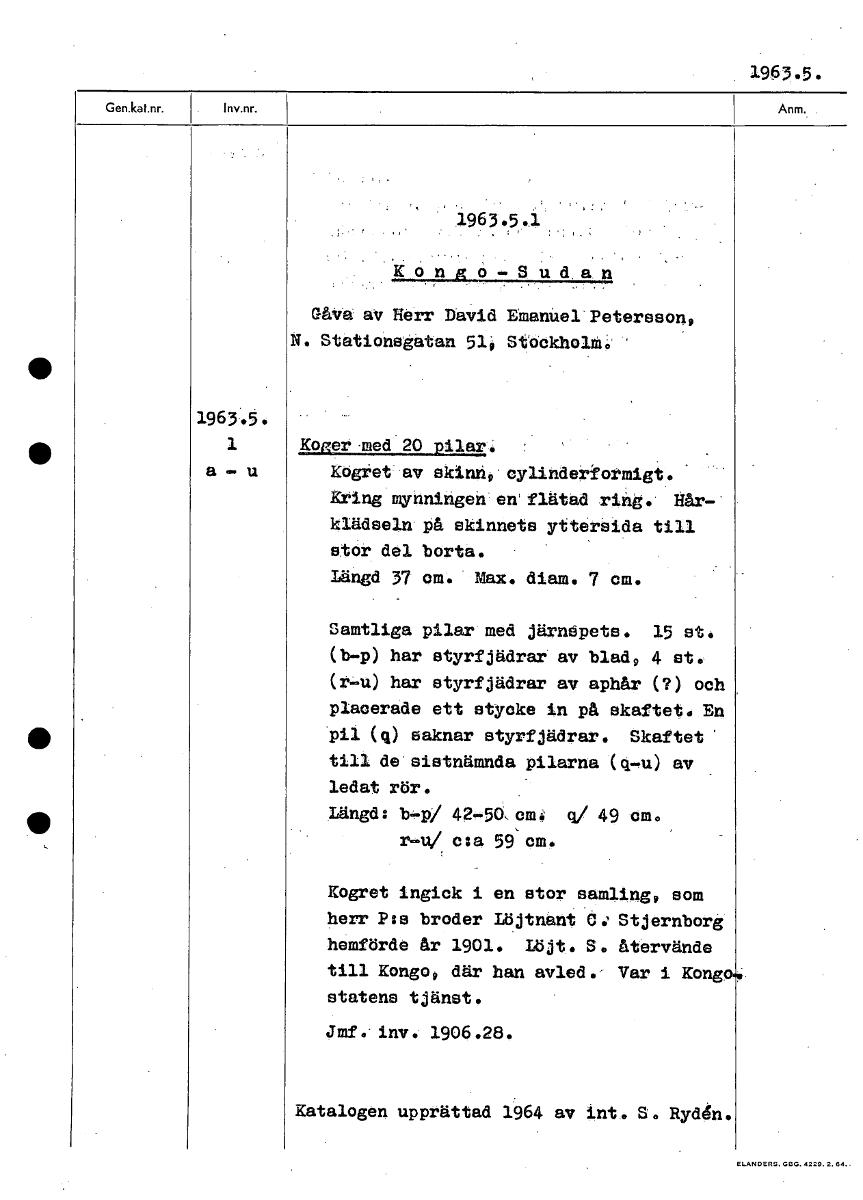 • 1953.5. 1963.5.1 IL2121£24111Jua Gåva av Herr David Emanuel Petersson, N. Stationsåatan 51, Stockholt. 1963 5. 1 Koger-med 20 pilar. a u Kogret av skinn,'cylindertormigt. Kring mynningen en'flätad rih... Visa hela