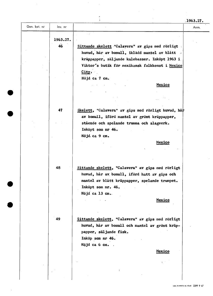 • ,1963.27. 1963.27.. 46 Sittande skelett "Calavera" av gips med rörligt huvud, hår av bomull, iklädd mantel av blått kräppapper, säljande kalebasser. Inköpt 1963 i Viktor's butik för mexikansk folkkons... Visa hela