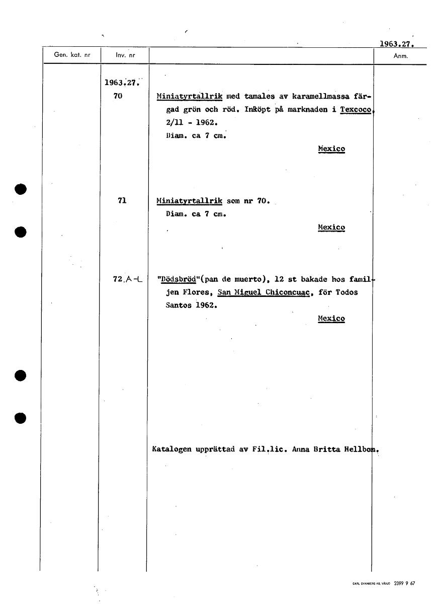 • 1963.27. 1963.2 . 70 Miniatyrtallrik med tamales av karamellmassa fär- gad grön och röd. Inköpt på marknaden i Texcoco 2/11 - 1962. Diam. ca 7 cm. Mexico 71 Miniatyrtallrik som nr 70. Diam. ca 7 cm. M... Visa hela