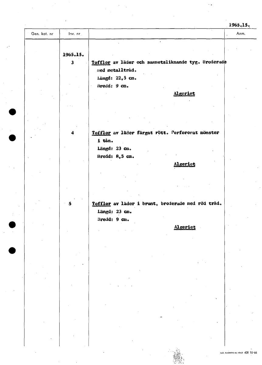 • 1965.15. 1965.15. 3 Tofflor av läder och sammetsliknande tyg. °roder; med metalltråd. Längd: 22,3 cm. bredd: 9 cm. Algeriet 4 Tofflor av läder färgat rött. Perforerat mönster 1 tån. Längd: 23 cm. Bred... Visa hela