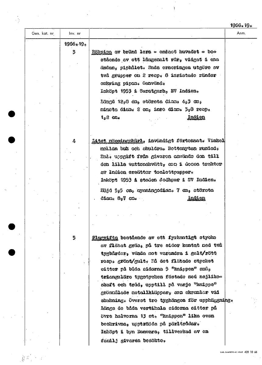 19664,19.# 1966 R-....glaula av bränd lera A. andaet huvudet ,bk tke atäendaev' ett långemalt rört, vidgat i ena andan0 P1Pbölet0 ,Mtida orneråneen, utgöra av två grupper om 2 reePA 8 larLetade ränder omkring pipan° Oanvänt Inköpt 1-953i Suratgarh0 NV Indien° Unga 1203 em0 etörata diu.36 403 am0 nänetn dlam6 2 em0 Inre diam* 309 voop 12 an* .jOielsk LL344110 invändigt tärtennatö Vinkel nel/an buk oeh okOldrao Bottegrtan rundadö EnIA uDpgitt trän 4tv3ron använda don till den lilla vattenekvätt0 nom i dopen traktor alor Indien ersättor tealottpapper6 Inköpt ¶953 å staden Jedhpur i NV budlenii Böjd 555 em0 nunnincediamii 7 em0 ettnota diamo 807 .024 APia:Le2 5 flunvitta betitlande av ett fyrkantigt, otYbko av flätat grätio, På tre aidor kantat ned tVä tygbårder0 vända-not varandra gult/rött reop6 grönt/Gult* ra det flätade °tycket eit•or På båda eldarna 5 "kniPPen" anå0 tri lära tygatycken fäetade med ne3lIko6. akaft och tråd, UPPtill på varje okniPPe" Grönnalade notallkläPParo cam ~ml"' vid ekakning4 överat tro tyshängen tör uPP11,9g längs de båda vertikala eldarna vitter på Uvro halvorna 13 bit. "kniPPon" lika ovan beekrivna pptt:daå pärltrådarA InköPt i byn »antiara0 tillverkad av en tamilJ givaren beoökt06 [ocr]