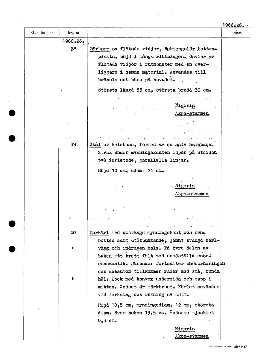.19664264., 19664264 . .38 Bärkorg av flätade vidjore Rektangulär, botten,- platta, böjd ..i långa riktningen., Gavlar av flätade vidjor J. rutmönster med en över- liggare i samma material. Användes till ' bränsle och bärs på huvudet. Största längd 53 cm- största bredd.39 am. Nigeria: Ahpa-stammen. 39 Skål av kalebass, formad av en halv kalebass° Strax under mynningskanten löper på utsidan två inristade, parallella linjer. Höjd 10 cm, diam. 24 cm. Nigeria Akpa-stammen 40 Lerkärl med utsvängd mynningskant och rund botten samt utåtbuktande„, jämnt svängd kärl-T a vägg och indragen hals. På övre delen av buken ett brett fält med snedställd snör- ornamentik: Härunder fortsätter snörornering n och dessutom tillkommer rader med små, runda b hål: Lock med konvex undersida ech tapp i mitten. Godset är mörkbrunt: kärlet användes vid torkning och rökning av kött: Höjd 10,5 cm, mynningsdian: 12 cm, största diam. över buken 13,5 cm. Godsets tjocklek 0,3 cm: 2Ageria Akpastammen [ocr]
