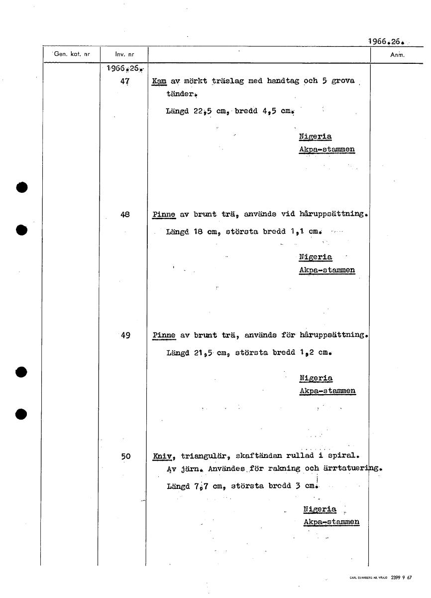 1966,26. 966 26,Y 47 Kam ay mörkt träslag med handtag och 5 grova: tänder. Längd 22i5 cm bredd 4,5 cm4 Nigeria Akpa.mstammen • 48 Pinne av brunt trä, används vid håruppsättning, Längd 18 cm, största bredd 1,1 cm. Nigeria Akpa -stammen 49 Pinne av brunt trä, används för håruppsättning. Längd 21 5.cm, största bredd 1,2 cm. Nigeria Akpa-stammen 50 Kniv, triangulär, skaftändan rullad i spiral. Av järn. Användes för rakning och ärrtatuer Längd 7i-,7 cm, största brodd 3 cm:, MAgeria Akpa-mstammen [ocr]