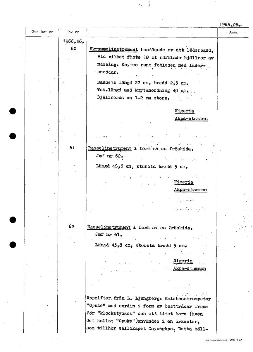 1966.264,- 1966,„26, 60 SkramMelinstrument bestående av ett läderband, vid vilket fästs 18 st räfflade bjällror av mässing. Knytes runt fotleden med läder- snoddar, Bandets längd 22 cm, bredd 2,5 cm. Tot.längd med knytanordning 40 om. Bjällrorna ca 1-2 cm stora. , Nigeria Akpastammen 61 Rasselinstrument i form av en fröskida, Jmf nr. 62. Längd 48,5 ome,största bredd 5 cm.. Nigeria Akpa-stammen 62 Rasselinstrument i form av en fröskida. Jmf nr 61.. Längd 45,5 cm r största bredd 5. Nigeria - Akpa-stammen Uppgifter från L. Ljungberg: Kalebaestrumpeter "Opuke" med sordin i form av basttrådar fram,. för "klockstycket" och ett litet horn (även det kallat "Opuke" )användes i en orkestero som tillhör sällskapet Onyongkpo, Detta Säll- [ocr]