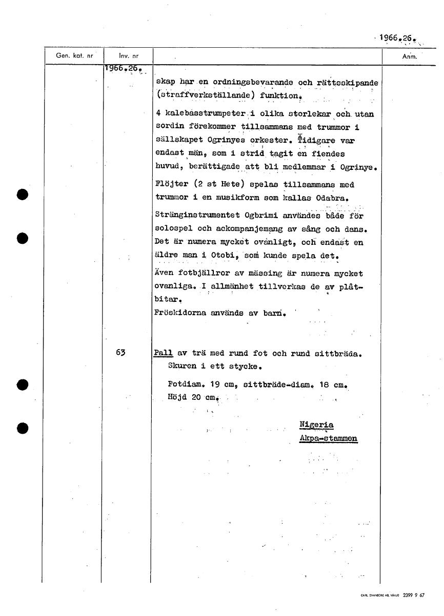 1966,26, 1966,26, skap har en ordningsbevarande och rättookipande (efraffVerkställande) funktion, 4 kalebasstrumpeter.i Olika storlekaroeh.utan sordin förekommer tillsammans med trummor i sällskapet Ogrinyes orkester, hdigare var endast män, som i strid, tagit en fiendes huvud, berättigade att bli medlemmar i Ogrinye. Flöjter (2 st Hete) spelas tillsammans med trummor i en musikform som kallas Odabra. Stränginstrumentet Ogbrimi användes både för solospel och ackompanjemang av sång och dans, Det är numera mycket ovanligt, och endast en äldre man i Otobi, som kunde spela det, Även fotbjällror av mässing är numera mycket ovanliga, .I allmänhet tillverkas de av plåt- bitar. Fröskidorna används av barå. 63 Pall av trä med rund fot och rund sittbräda. Skuren i ett stycke. Potdiam, 19 cm, sittbräde,idiam, 18 cm, Höjd 20 emu • 2.1.a.92111,9 Akpa-istammen [ocr]