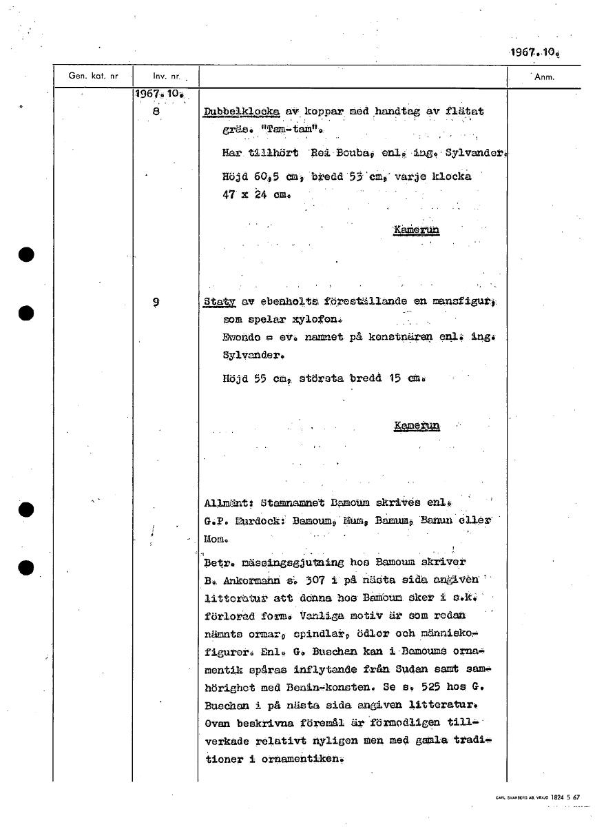 1967.10:, 19whioA a Dubbelkloak a av. koppar med handtag av flätat gräs: non-tam" Har. tillhört Roi Boubap enl: ing Sylvander Höjd 6005 amt, bredd 53 cm, varje klocka 47 x 24 em° Kanierun Stats] av ebenholts föreställande en mansfiguri som spelar xylofon: Rwondo = eV0 namnet på konstnären enl: ing: Sylvander. Höjd 55 cmv. Största bredd 15 em° anä_Le:run Allmäntg Stamnamnet Damolum skriVes en14 (41): Murdeckg Bamoump .Sump Bamump "K/1=n 011ar Mom. Betr: mäseingsgjutning hos Bamoum skrivsr B: Ankormahn s: 307 i på nästa sida angiven litteratur att denna hos Bambum sker i k.;' förlorad form: Vanliga motiv är som redan nämnts ormars, sPindlarp ödlor och människor, figurer: Enl: Buseban kan i Bemoume orna- mentik sparn0 inflytande från Sudan samt sam' hörighct med Benin-ikonnteno Se so 525 hos G. Busehan i på nästa sida angiven litteratur: Ovan beskrivna föremål är förmodligen verkade relativt nyligen men med gamla träditioner i ornamentiken. [ocr]Stäng