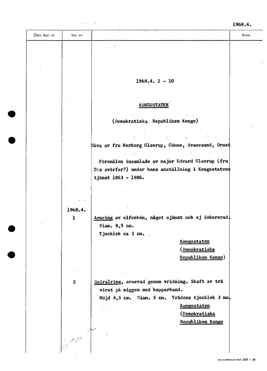 1968.4. 1968.4. 1 - 10 KONGOSTATEN (Demokratiska. Republiken Kongo) 3åva av fru Herborg Gleerup, Gömme, Svanesund, Orus .Föremålen insamlade av major Edvard Gleerup (fru G:s svärfar?) under hans anställning i Kongostaten tjänst 1863 - 1886. 1968.4. 1 Armring av elfenben, något ojämnt och ej dekorerad Diam. 8,5 cm. Tjocklek ca 2 cm. , Kongostaten (Demokratiska Republiken Kongo) 2 Spiralring, ornerad genom vridning. Skaft av trä virat på miggen med kopparband. Höjd 4,5 cm. Diam. 5 cm. Trädens tjocklek 3 mm Kongostaten (Demokratiska Republiken Kongo [ocr]