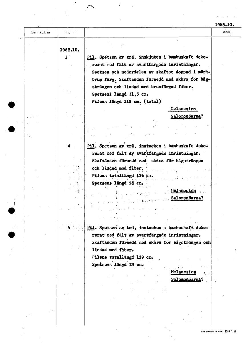 1968.10. Pil. Spetsen av trä, inskjuten i bambuskaft deko- rerat med fält av svartfärgade inristningar. Spetsen och nederdelen av skaftet doppad i mörk- brun färg. Skaftänden försedd med skåra för båg- strängen och lindad med brunfärgad fiber. Spetsens längd 31,5 cm. Pilens längd 119 cm. (total) Melanesien Salomonöarna? Pil. Spetsen av trä, instucken i bambuskaft deko- rerat med fält av svartfärgade inristningar. Skaftänden försedd. med: skåra för bågsträngen ' och lindad med fiber. Pilens totallängd 126 Spetsens längd 28 cm. Melanesien Salomonöarna? Pil. Spetsc•av trä, instucken i bambuskaft deko- rerat med fält av svartfärgade inristningar. Skaftänden försedd med skåra för bågsträngen och lindad med fiber. Pilens totallängd 129 cm. Spetsenslängd29 cm. Melanesien Salomonöarna? [ocr]Stäng