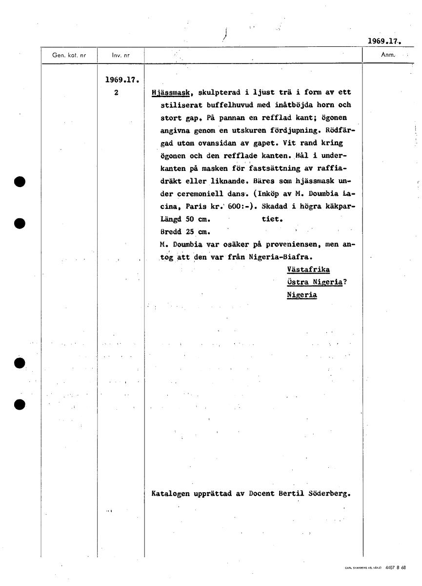 1969.17.. 1969.17. 2 Hjässmask, skulpterad i ljust trä i form av ett stiliserat buffelhuvud med inåtböjda horn och stort gap. På pannan en refflad kant; ögonen angivna genom en utskuren fördjupning. Rödfär- gad utom ovansidan av gapet. Vit rand kring ögonen och den refflade kanten. Hål i under- kanten på masken för fastsättning av raffia- dräkt eller liknande. Bäres som hjässmask un- der ceremoniell dans. (Inköp av M. Doumbia La- cina, Paris kr.' 600:-). Skadad i högra käkpar- Längd 50 cm. tiet. Bredd 25 cm. M. Doumbia var osäker på proveniensen, men an- tog att den var från Nigeria-Biafra. Västafrika Östra Nigeria? Nigeria Katalogen upprättad av Docent Bertil Söderberg. [ocr]Stäng
