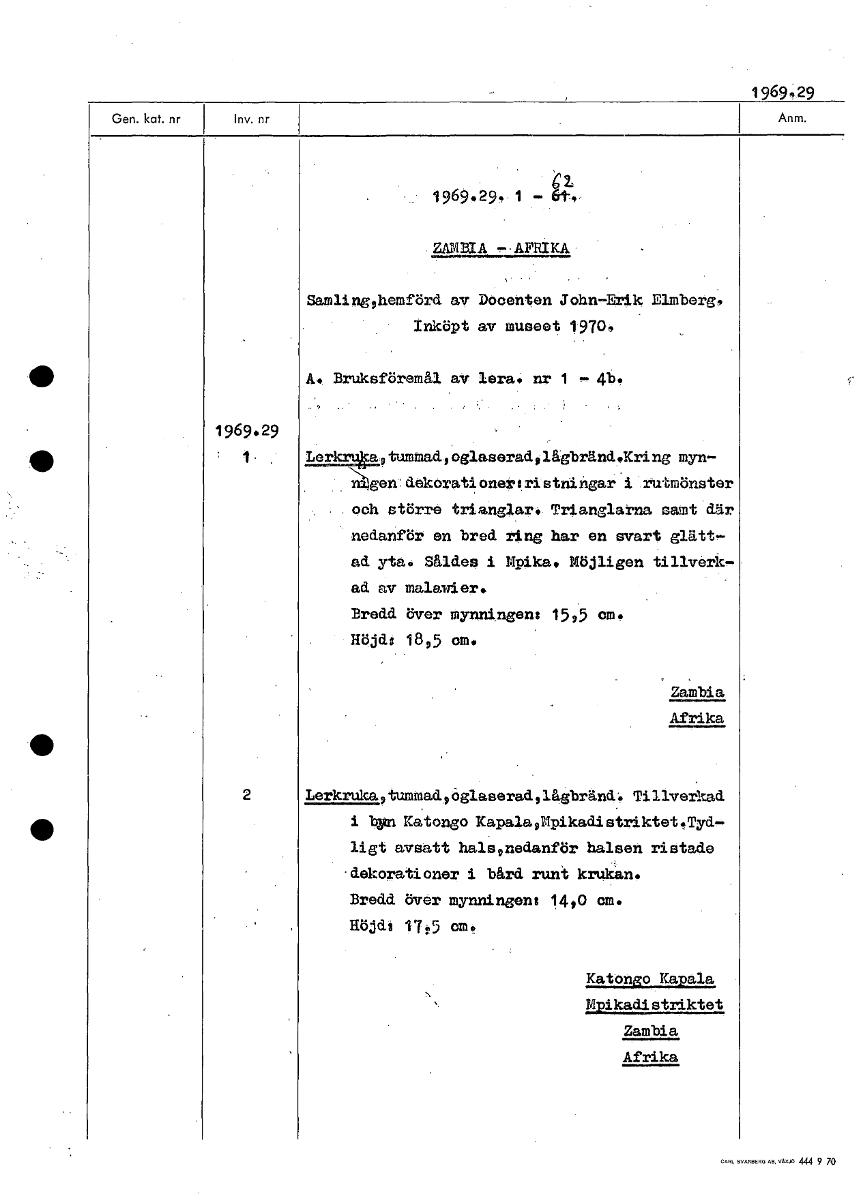 196949 1969.29,.1 6t ZAMBIA AFRIKA Samling9hemförd av Docenten John-Erik Elmberg, Inköpt av museet 1970, A. Bruksföremål av lera. nr 1 4 • 1969.29 1969.291. L2~19tummad9oglaseradolkbränd4Xringmyn- gen.dekorationersristningari rutmönster och större trianglar.. Trianglarna samt där nedanför en bred ring har en svart glätt- ad yta. Såldes i Mpika. Möjligen tillverk- ad av malawier. Bredd över mynningens 1595 om. Höjd: 1895 om. Zambia Afrika 2 Lerkruka9tummad9Cglaseradllågbränd. Tillverkad i byn KatongoKapala9Mpikadistriktet.Tyd- ligt avsatt hals9nedanför halsen ristade dekorationer i bård runt krukan. Bredd över mynningen: 1490 cm. Höjds 17:5 em. Katongo Kapala Mpikadistriktet Zambia Afrika [ocr]Stäng