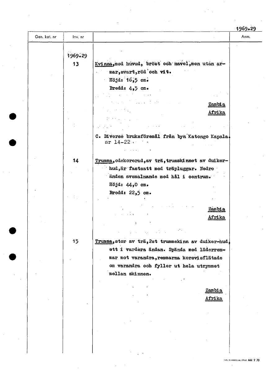 1969.29 1969.29 13 Kvinna,med bröst och hå4elAen utan at- mar,sart,rödsoch Höjda 1'6!5 cm. Bredd: 4,5 om. Zambia Afrika C. DiVeråe bruksföremål från bynlatongo Kapala nr 1422 = 14 Trummagodekorerad,av trägtrumskinnet av duiker, hudgär.faatsatt med,träpluggar. Nedre - änden avsmalnande med hål i centrum.- Hö, d' 440 om. Bredd: 22,5 om. Zåffibia Afrika 15 Trummagstor av trä,2st trummskinn av duiker-hud, ett i vardera ändan. Spända med läderrem- mar mot varandra remmarna korsvisflätade om varandra och fyller ut hela utrymmet mellan skinnen. Zambia Afrika [ocr]