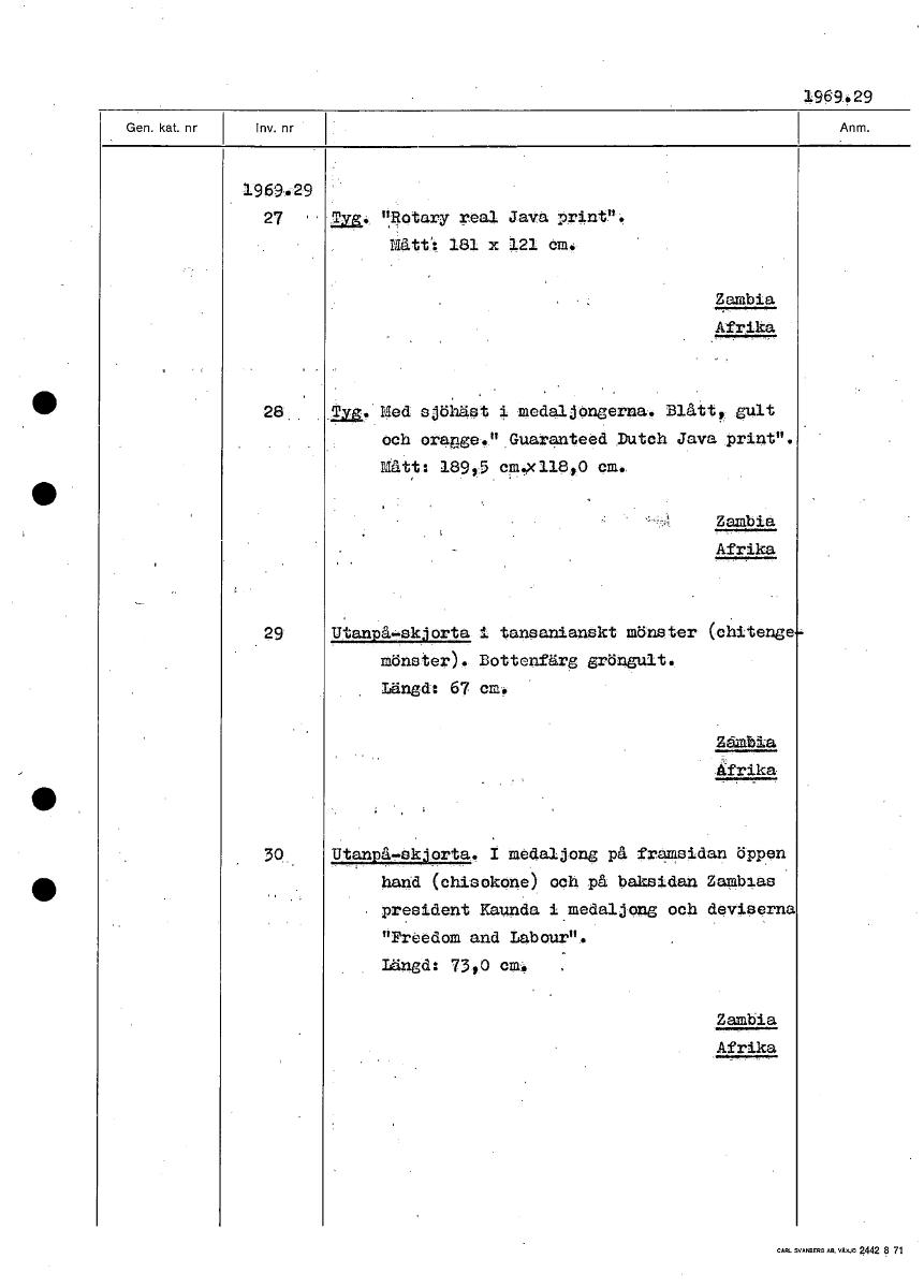1969.29 1969.29 27 -7223,4 f10tarY real Java print". Mått': 181 x 121 Cm. Zambia Afrika 28 jkal.ged efflbäat i medaljongerna. Blått, gult och orange." Guaranteed Dutch Java print". Mått: 189,5 em.x118,0 cm. Zambia Afrika 29 Utanpå.skjorta i tansanianskt mönster (chitenge mönster). Bottenfärg gröngult. Längd: 67 cm. Zambia Afrika 3Q, Utanpå,-skorta. I medaljong på framsidan öppen hand (chisokone) och på baksidan Zambias president Kaunda i medaljong och deviserna "Freedom and Labour". Längd: 73,0 cm. Zambia Afrika [ocr]