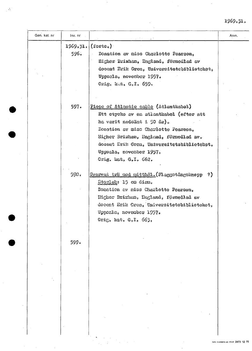 1969.31. 1969.54 'orts.) • Donation av nios Charlotte Pearcong • BIGher Brixham, Enalaw4 förmedlcd av docent Erik Group Univoreltetebiblietoket, Uppsala, novembow 19574 Orig. k,It. G, 659. 597. Pio of Atlantic ca 10 (At1a4thabe1) • Ett etycke av en atlantkabel (efter att ha varit nedeänt i 50 Depatien ev MiG0 Oha7.4ette Poareen, Eighor Brizham, Enginad4 förmedlad av4 docent Erik Gren„ Univereitctsbibliptakot, UPPPala4 november 1957. Orig. hat. G.I. 662. 590. med mitthäl. PlagaetångeknoPP rlekt 15 cm dian. Donation av ris Charlotte Peepocn, Ukas Brinham, England, fOrmedlad av docent Erik Gren, Univereitetobiblieteket, Uppeala, november 19574 • Orie. kat. G.Z. 663. • con [ocr]