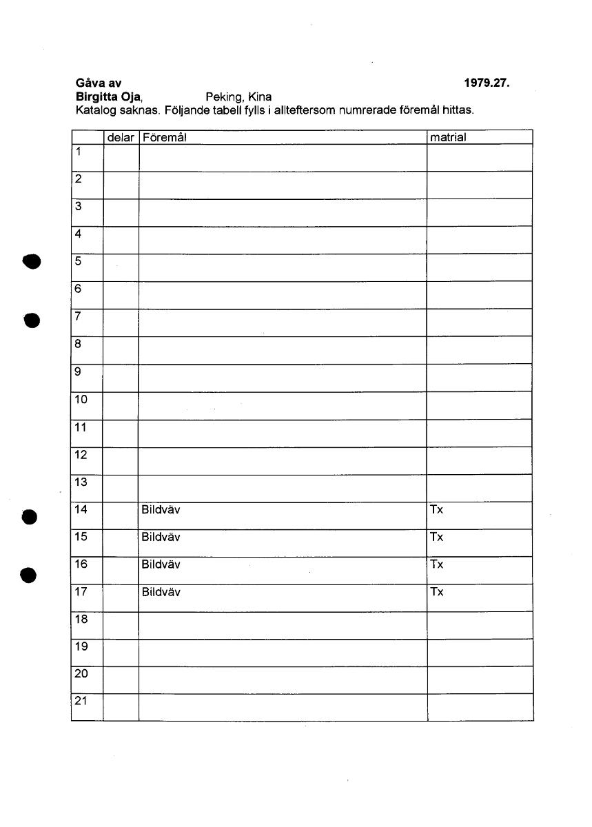 • Gåva av 1979.27. Birgitta Oja, Peking, Kina Katalog saknas. Följande tabell fylls i allteftersom numrerade föremål hittas. delar Föremål matrial 1 2 3 4 5 6 7 8 9 10 11 12 13 14 Bildväv Tx 15 Bildväv Tx 16 Bildväv Tx 17 Bildväv Tx 18 19 20 21 [ocr]