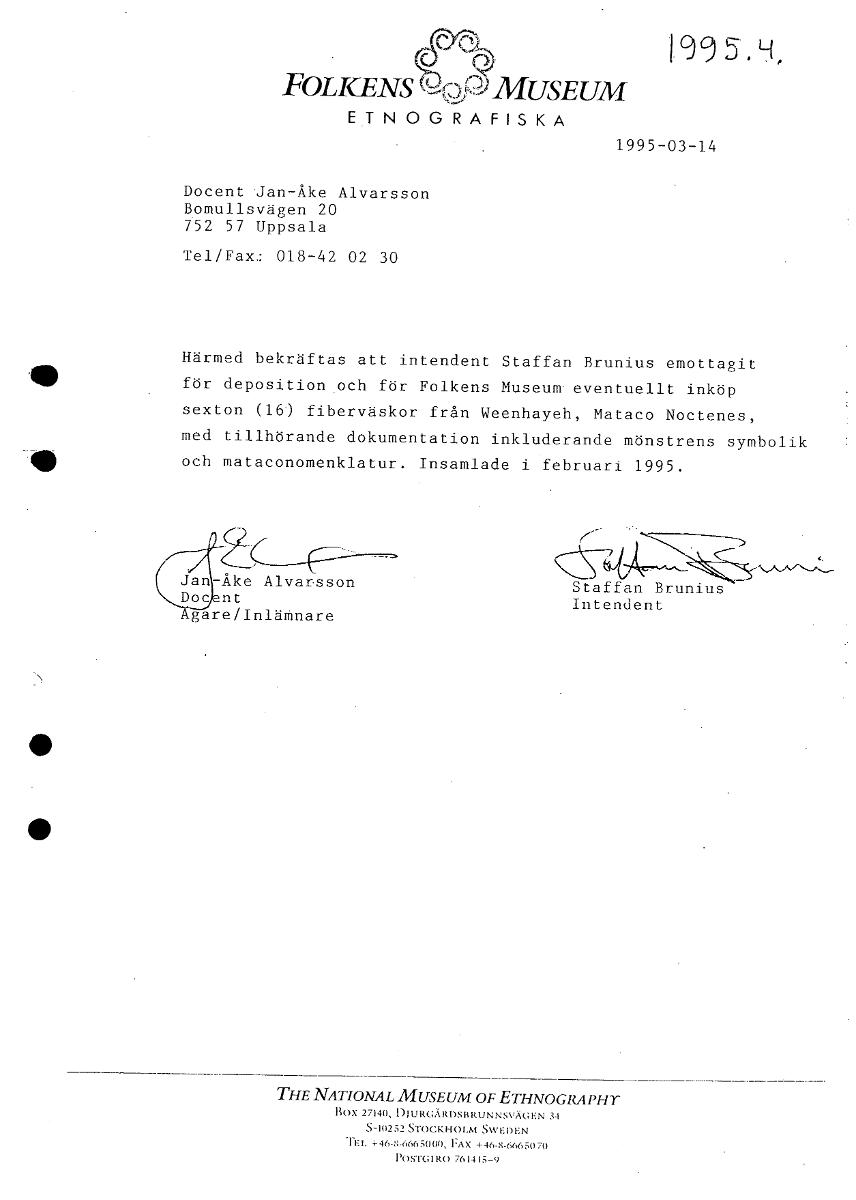 v99 5 H, FOLKENS -=---(3,3 MUSEUM ETNOGRAFISKA 1995-03-14 Docent Jan-Åke Alvarsson Bomullsvägen 20 752 57 Uppsala Tel/Fax: 018-42 02 30 Härmed bekräftas att intendent Staffan Brunius emottagit • för deposition och för Folkens Museum eventuellt inköp sexton (16) fiberväskor från Weenhayeh, Mataco Noctenes, med tillhörande dokumentation inkluderande mönstrens symbolik och mataconomenklatur. Insamlad...Visa hela
