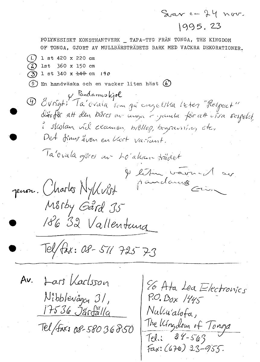 Q— 9_14 \ g 5 . 2-3 POLYNESISKT KONSTHANTVERK TATA—TYG FRÅN TONGA, THE KINGDOM OF TONGA, GJORT AV MULLBÄRSTRÄDETS BARK NED VACKRA DEKORATIONER. 0 1 st 420 x 220 cm ist 360 x 150 cm 1 st 340 x a-4.0- cm l90 En handväska och en vacker liten häst C) 5 C v1 ( I 6-e vu I;'1- 9 : (.r t ctftA, hår(' CA-t-- a_ kj i Ce,t-t-1 ,5t- ig //Ca, Pu4 I kit/61-1 e4,4 .-c21-'1"" , cc_( (C't f c-yir. Ckartes \(7(iff)-. rA.7itgir-ce JL • /3)6 1,4,..//144(A,vtc.( • T: (49- s-y/ 7-3 Av- LcLyovi j—a-nr 410,_ iect ,U'lkieAfjo, 3/ PdöG bd1c )61,1 ) HT3(; 3a-r //Q a1( ) filt it I a 7 ) 4. ef-101 og-syo 3 6 RSV ------ t: ((;9-(o) [ocr]