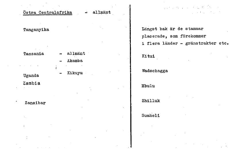 • östra Centralafrika allmänt Längst bak är de stammar placerade, som förekommer i flera länder - gränstrakter etc. Tanganyika Tanzania Uganda Kitui Wadschagga Mbulu Shilluk Suaheli - allmänt - Akamba -... Visa hela
