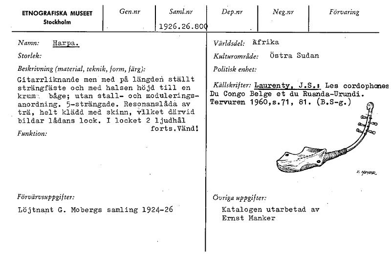 ETNOGRAFISKA MUSEET Stockholm Gen.nr Saml.nr 1926.26.80 Dep.nr Neg. nr Förvaring Namn: Harpa. Storlek: Beskrivning (material, teknik, form, färg): Gitarrliknande men med på längden ställt strängfäste och med halsen höjd till en krum7. båge; utan stall- och modulerings- anordning. 5-strängade. Resonanslåda av trä, helt klädd med skinn, Vilket därvid bildar lådans lock. I locket 2 ljudhål forts.Vänd! Funktion: Förvärvsuppgifter: Löjtnant G. Mobergs samling 1924-26 Världsdel: Afrika Kulturområde: Östra Sudan Politisk enhet: övriga uppgifter: Katalogen utarbetad av Ernst Manker Källskrifter: Laurenty, J.S.: Les cordophones Du Congo Belge et du Ruanda-Urundi. Tervuren 1960,s.71, 81. (B.S-g.) n y'kycw,.. [ocr]