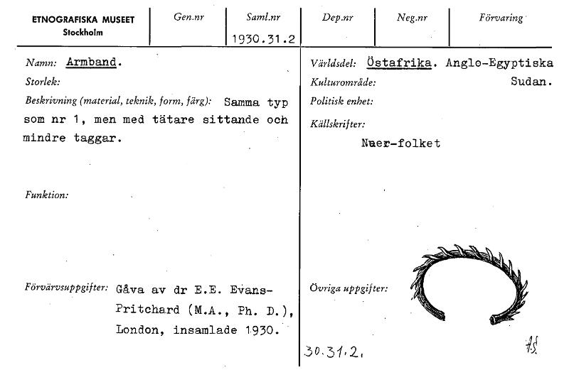 ETNOGRAFISKA MUSEET Stockholm Gen.nr Saml.nr Dep.nr 1930.31.2 Neg.nr Förvaring • Namn: Armband. Storlek: Beskrivning (material, teknik, form, färg): Samma typ SOM nr 1, men med tätare sittande och mindre taggar. Funktion: Förvärvsuppgifter: Gåva av dr E.E. Evans- Pritchard (LA., Ph. D.), London, insamlade 1930. Världsdel: Östafrika. Anglo—Egyptiska Kulturområde: Sudan. Politisk enhet: Källskrifter: Ne.er—folket övriga uppgifter: 30,31F2., 15f [ocr]