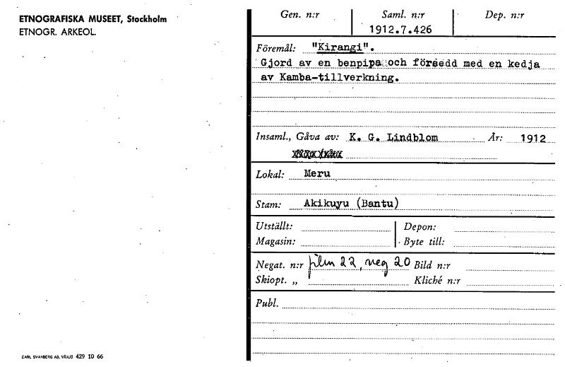 • ETNOGRAFISKA MUSEET, Stockholm ' ETNOGR. ARKEOL. Gen. n:r I Saml. n:rDep. n:r I 1912.7.426 Föremål: Gjord av en benpipacoch fördedd med en kedja av Kamba -tillverkning. Insaml., Gåva av: K. Ge LindbiQ... Visa hela