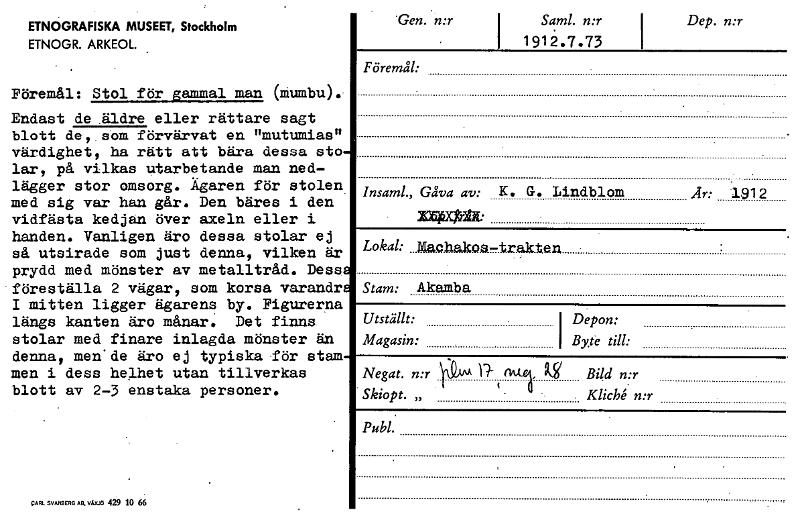 ETNOGRAFISKA MUSEET, Stockholm ETNOGR. ARKEOL. Gen. n:r I Saml. n:r 1912.7.73 Dep. n:r Föremål: Föremål: Stol för gammal man (niumbu). Endast de äldre eller rättare sagt blott de, som förvärvat en "mu...