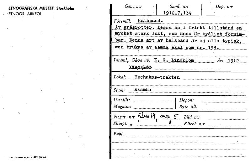 ETNOGRAFISKA MUSEET, Stockholm •ETNOGR. ARKEOL. Gen.. n:r Saml. n:r I De p. n:r I 1912.7.139 Föremål: Halsband. Av gräsrötter. Dessa ha i friskt tillstånd en mycket stark lukt, som ännu är tydligt förnim- bar. Denna art av halsband är ej alls typisk, men brukas av samma skäl som nr. 133. Insaml., Gåva av: K. G. Lindblom År: 1912 XX2111.415K Lokal: Machakos-trakten Stam: Akamba Utställt: Depon: Magasin: I Byte till: Negat.. n:r 5- Bild n:r Skiopt. „ Kliché» n:r Publ. CARL SVANBERG AB, VÄRJO 429 10 66 [ocr]Stäng