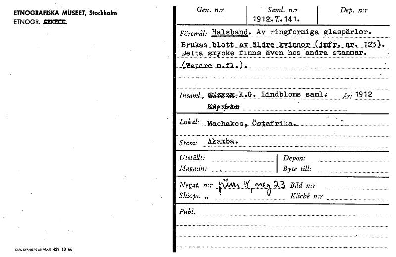 • ETNOGRAFISKA MUSEET, Stockholm ETNOGR. 11:IZiCECJL. Gen. n:r I Saml. n:r 1912.72.141. Dep. n:r Föremål: Halsband. Av ringformiga glaspärlor. ..Brukas blott av äldre kvinnor ejtafr. nr. 1231• Detta smy... Visa hela