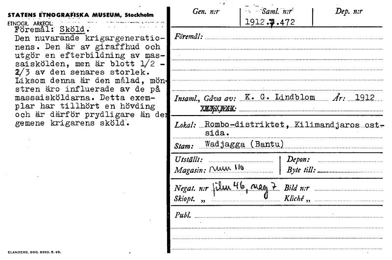 • Gen. n:r S'aml.Dep. mr 1912 .7 .472 I Föremål: Insaml., Gåva av: K. G. Lindblom År: 1912 STATENS ETNOGRAFISKA MUSEUM, Stockholm ETNOG R. ARKEOL: Föremål: Sköld. Den nuvarande krigargeneratio- nens .... Visa hela