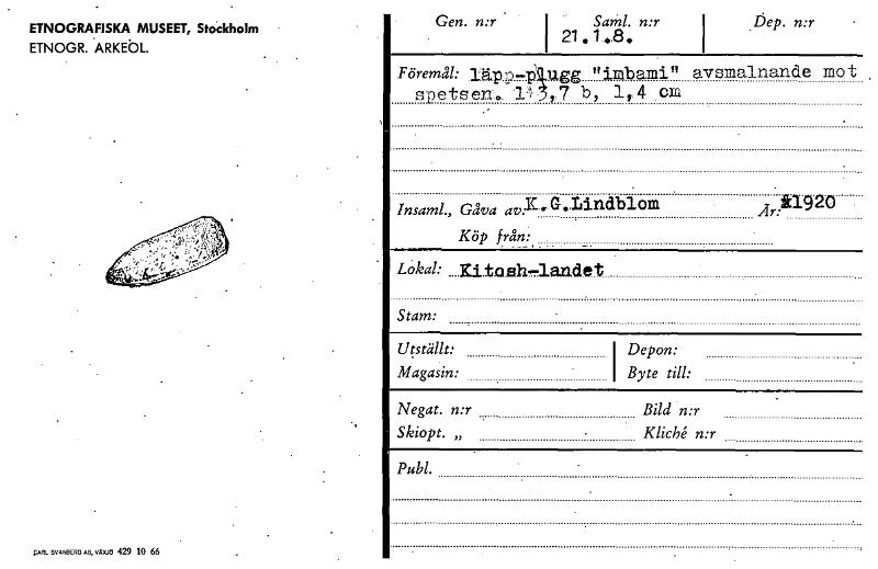 ETNOGRAFISKA MUSEET, Stockholm ETNOGR. ARKEÖL. Gen. n:r I Sand. n:r 21 • 1.8. Dep. n:r Föremål: ,Ikap-.p' ugg nimbamin avsmalnande mot , spetsen-i.. I,,7 b, 1,4 cm *1920 Insaml., Gåva av:K.4.• Iindb...