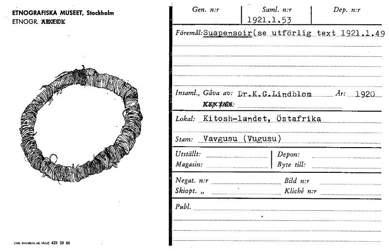 • ETNOGRAFISKA MUSEET, Stockholm ETNOGR. ARMEE* Gen. n:r i Saml. n:r 1921.1 .53 Dep. n:r Föremål:Suspensoi.r(se utförlig text 1921 1.4.9 Insaml., Gåva av: Dr..K...G.Lin.dhlo.m År: 19.2.0 Kitpc1322K.: ... Visa hela