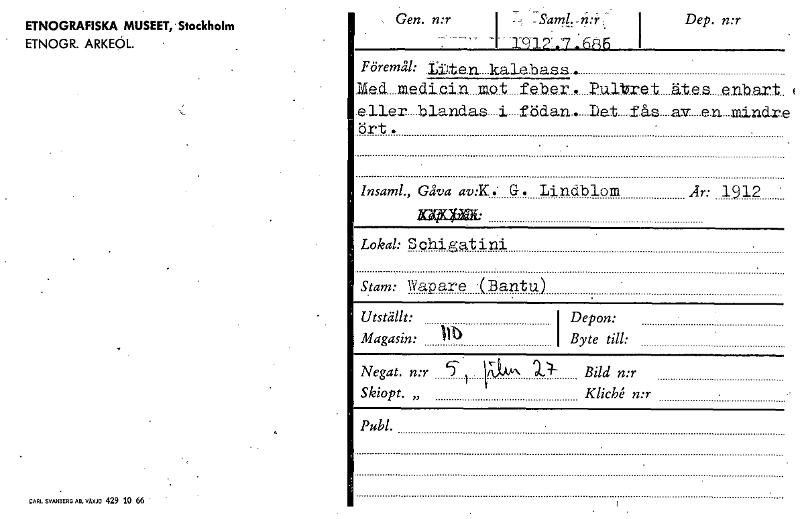 • ETNOGRAFISKA MUSEET, Stockholm ETNOGR. ARKEOL. D Gen. n:r ep. n:r — Föremål: ri)ten kalebass. Bed medicin mot feber. Pultret ätes enbart eller blandas I födan. Det fas av en mindre ört . Insaml., Gåva... Visa hela