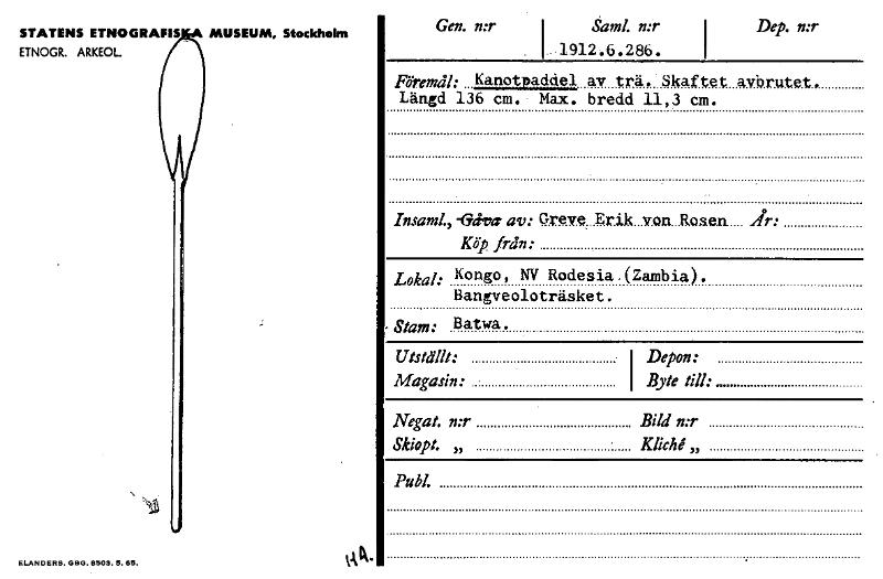 • STATENS ETNOGRAFIS MUSEUM, Stockholm ETNOGR. ARKEOL Dep. n:r Föremål: ...Kanotpaddel av trä. Skaftet avbrutet Längd 136 cm. Max. bredd 11,3 cm. Gen. n:rI Saml. n:r I 1912.6.286. Insaml.,-Gkra av: Q.re... Visa hela
