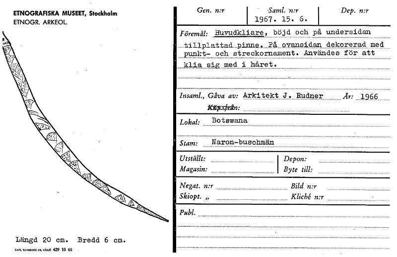 ETNOGRAFISKA MUSEET, Stockholm ETNOGR. ARKEOL. Gen. n:r I Saml. n:r 1967 . 15. 6. .Dep. n:r Föremål: Huvudkliare, böjd och på undersidan tillplattad pinne, På ovansidan dekorerad med punkt- och streckornament. Användes för att klia sig med i håret. Insaml., Gåva av: Arkitekt J. Rudner År: 1966 Lokal: Botswana Stam: Naron—buschmän Utställt: Depon: Magasin: I Byte till: Negat. n:r Bild n:r Skiopt. „ Kliché n:r Publ. Längd 20 cm. Bredd 6 cm. CARL SVANBERG AR, VÄXJÖ 429 10 66 . [ocr]Stäng