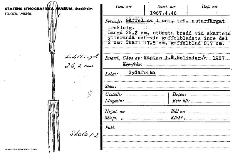 STATENS ETNOGRAFI ETNOGR. ~K. ELANDERS. G8G. 8503. 5. 85. USEUM, Stockholm .74 -y 02 ‘, Gen. n:r Saml n:r I Dep. n:r 1967.4.46 1 av 1 ju _ rät n aturf _ 4rgat Föremål: Gåffe st trekloig.. -- Längd ...