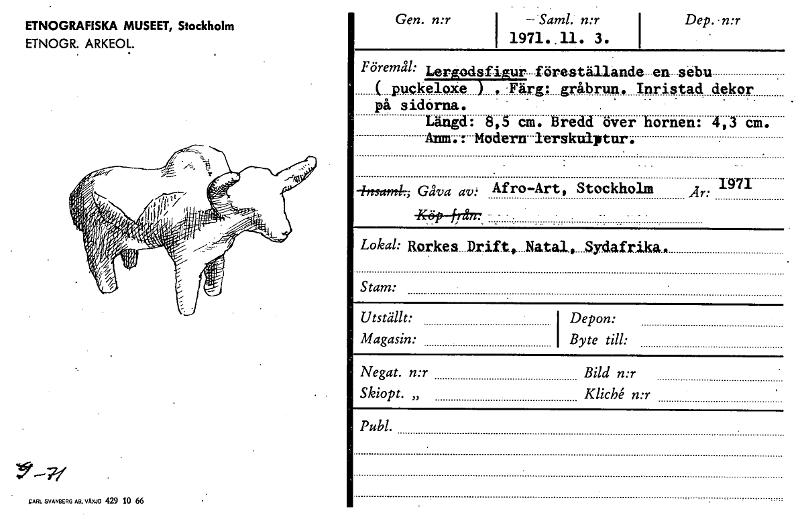 ETNOGRAFISKA MUSEET, Stockholm ETNOGR. ARKEOL. Gen. n:r I --Saml. n:r 1971.. 11. 3. Dep.-n:r Föremål: Lerkodsfigur föreställande -en -sebu ( puckeloke ) ,.Färg: gråbrun. Inristad dekor på sidorna. Längd: 8,5 cm. Bredd över hornen: 4,3 cm. Anm. Modern Ierskulptur. -21nyamir; Gåva av: Afro -Art, Stockholm Lokal: Rorkes Drift, Natal, Sydafrika. Stam: Utställt: Depon: Magasin: I Byte till: Negat. n:r Bild n:r Skiopt. „ Kliché n:r Publ. 1971 Är: -1Vre5H.rån7 EARL SVANBERG AB, VÄXJÖ 429 10 66 [ocr]