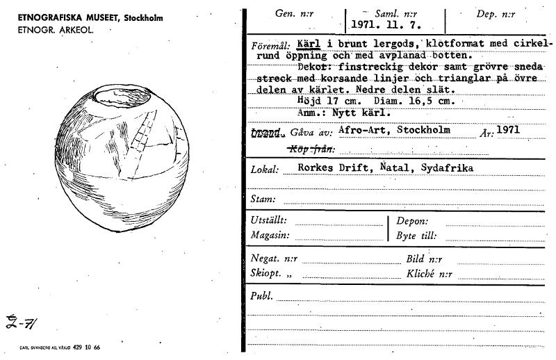 • • • Dep. n:r ETNOGRAFISKA MUSEET, Stockholm ETNOGR. ARKEOL. • paa SVANBERG AB, VÄXJÖ 429 10 66 Föremål: Kärl i brunt lergods, "klotformat med cirkel- rund öppning och med avplanad botten. Dekor: finst... Visa hela