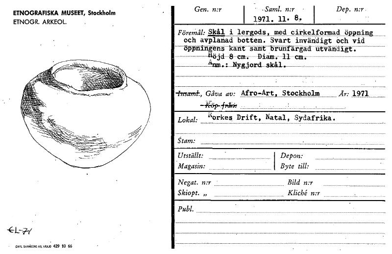 ETNOGRAFISKA MUSEET, Stockholm ETNOGR. ARKEOL. . Gen. n:r-•Saml. n:r I Dep. n:r I • 1971. 11. 89 Föremål: Skål i lergods, med cirkelformad öppning och avplanad botten. Svart invändigt och vid oppnin...