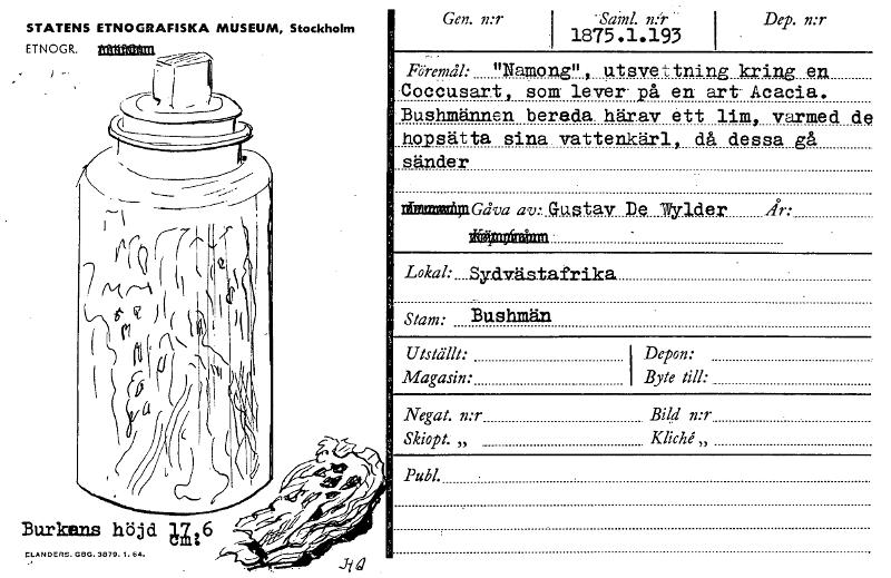 STATENS ETNOGRAFISKA MUSEUM, Stockholm ETNOGR. i 1.1f Burkens höjd U:6 ELANDERS. GBG. 3879. 1. 64. Gen. n:r I _.. I -Sand. n:r.. i 1875 .1.193 Dep. n:r Föremål: "Namone 2. utsvettning kring en Coccusart, som lever- på en art- Acacia. Bushmännen bereda- härav ett lim, varmed de hopsätta sina vattenkärl, då dessa gå sänder ~Gåva av: G.ustav De Te.lder År: ,,ett.V,t, ■41,90,,, Lokal: ....Sydvästafrika - Stans: Bushmän Utställt: Magasin: I Depon: Byte till: Negat. n:r Bild n:r Skiopt. „ Kliche. „ Publ. [ocr]