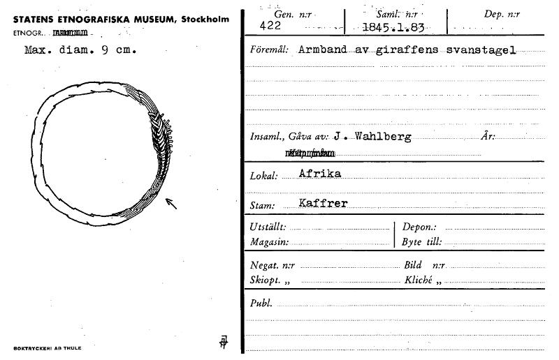 • Gen. n:r • h:r I Dep. n:r 422 1845-.1-.83-• Föremål: Armband av giraffens svanstagel STATENS ETNOGRAFISKA MUSEUM, Stockholm ETNOGR. MEI= - Max. diam. 9 cm. Utställt: Magasin: Depon.: Byte till: Insaml... Visa hela