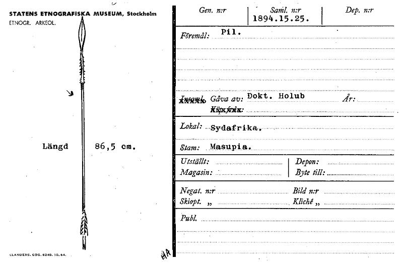 • Gen. n:r STATENS ETNOGRAFISKA MUSEUM, Stockholm ETNOGR. ARKEOL. Sanil. n:r 1894.15.25. Dep. n:r Föremål: Pil . ][31,429b Gåva av: Dok t . Holub Lokal: Sydafrika. Stam: Masup i a. År: Utställt: Magasi... Visa hela