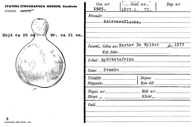 • STATENS ETNOGRAFISKA MUSEUM, Stockholm ET N OG R. -A-RieEt7r- 4r-s Höjd ca 29 Br. . ca 21 cm. ELANDERS. GSG. 31379. 1.84. Gen. n: r 1905• - - --,Sa- nii. n:r___' i 1875.1. 77. Dep. n:r Föremål: Kalaba... Visa hela