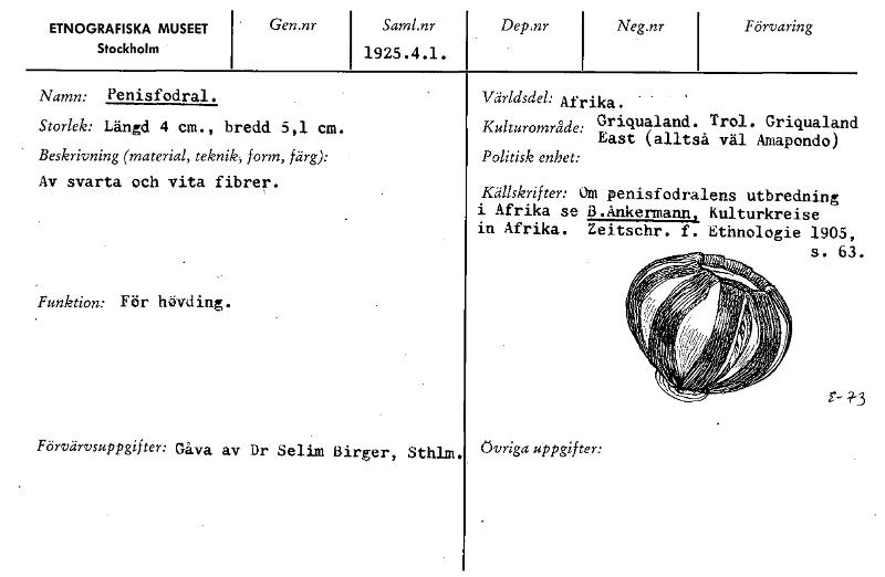 ETNOGRAFISKA MUSEET Stockholm Gen.nr Saml.nr 1925.4.1. Dep.nr Neg.nr Förvaring Namn: Penisfodral. Storlek: Längd 4 cm., bredd 5,1 cm. Beskrivning (material, teknik; form, färg): Av svarta och vita fibrer. Funktion: För hövding. Förvärvsuppgifter: Gåva av Dr Selim Birger, Sthlm. Världsdel: Afrika. Griqualand. Trol. Griqualand East (alltså väl Amapondo) Politisk enhet: Källskrifter: Orn penisfodralens utbredning i Afrika se B.Ankermann, Kulturkreise in Afrika. Zeitschr. f. Ethnologie 1905, s. 63. t- Övriga uppgifter: Kulturområde: [ocr]