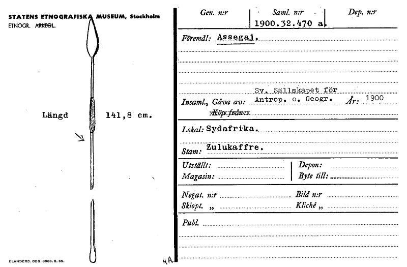 STATENS ETNOGRAFISK MUSEUM, Stockholm ETNOGR. AtICEeL. Dep. n:r Gen. n:rI Saml. n:r . 11900.32.470 Föremål: Assegaj , Längd 141,8 cm. Sy, Säilgicapet för Insaml, Gåva av: Antrop. o. Geogr. /h, 1900...