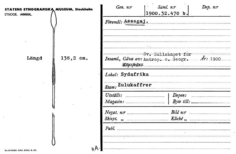 STATENS ETNOGRAFISK MUSEUM, Stockholm ETNOGR. ARKEOL. Gen. n:r Särni. n:r 1 Dep. n:r .11900.32.2170 b.1 Föremål: Assegaj. Sv. Sällskapet för Insaml., Gåva av: Antro.p......o.,...Geogr. År: 1.90.0 je i...